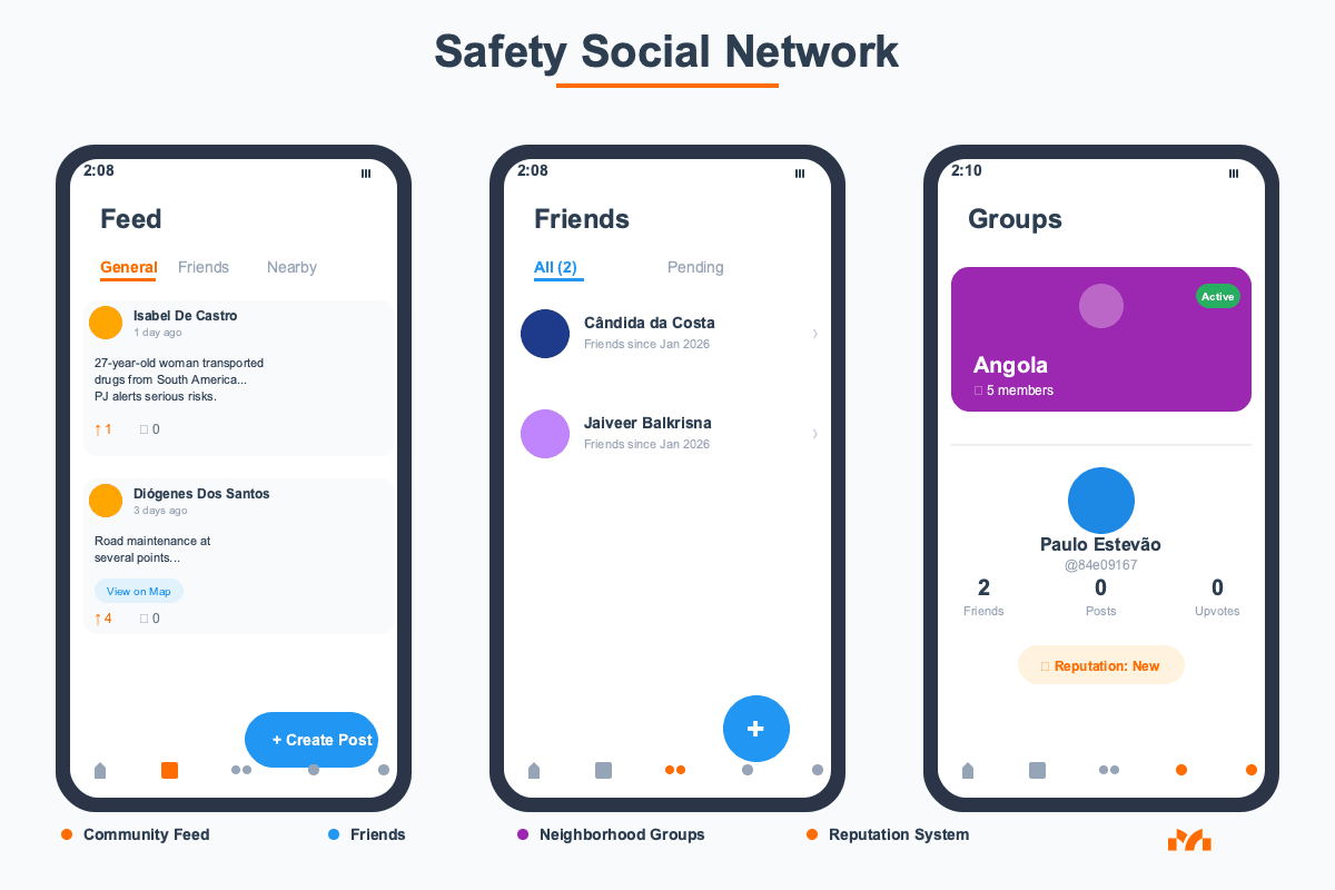 - Create/join neighborhood groups β "Alvalade Safety", "Olivais School Moms"
