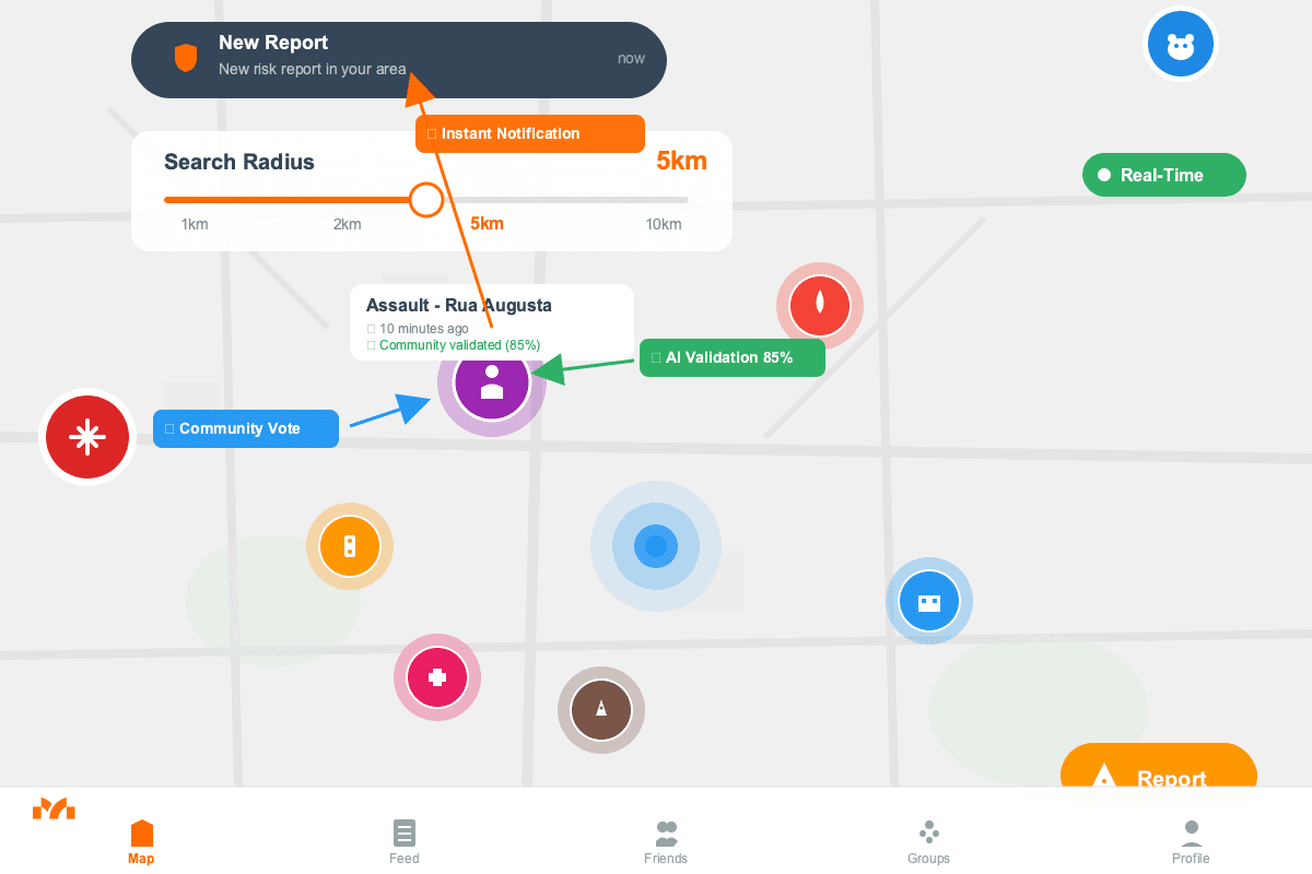The Problem: Today, information about urban dangers is fragmented in WhatsApp groups (40% fake news), unverified social media posts, or police data delayed by 30 days.